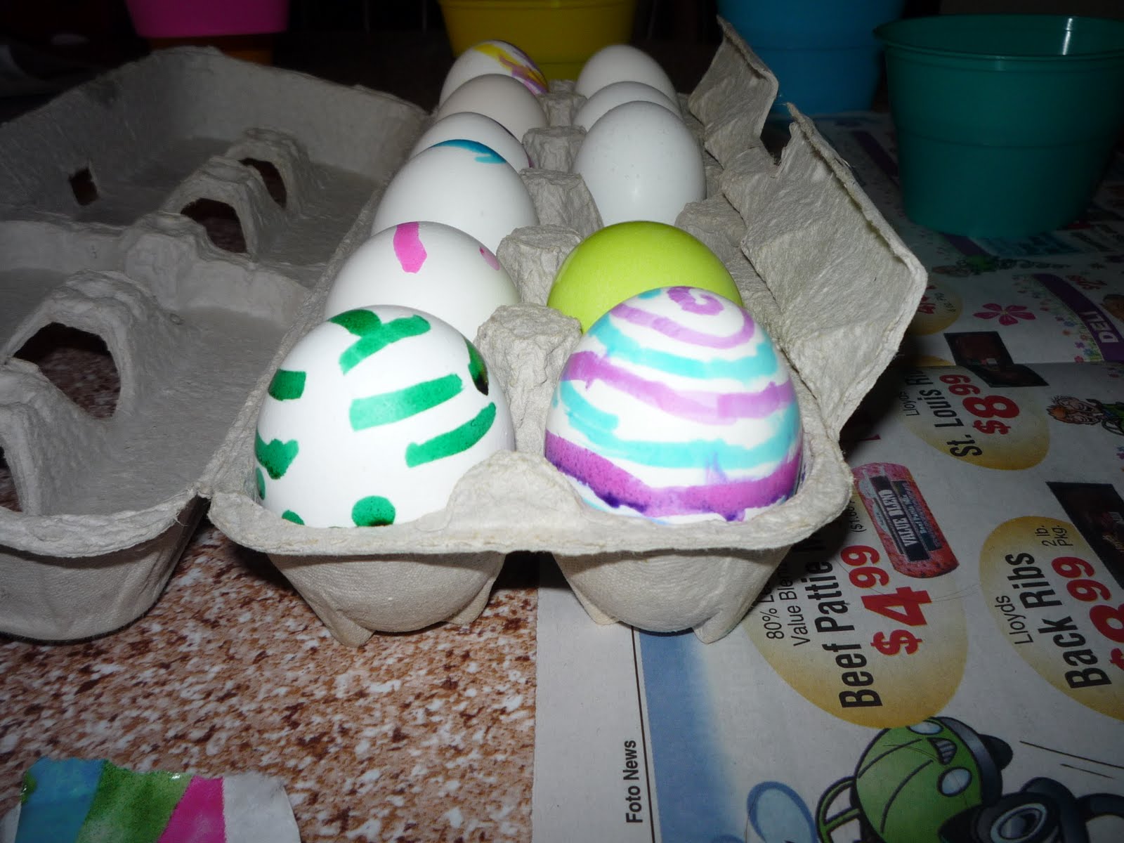 On Saturday night the boys and I colored eggs. There were so many colors and so few eggs. The boys got really creative!